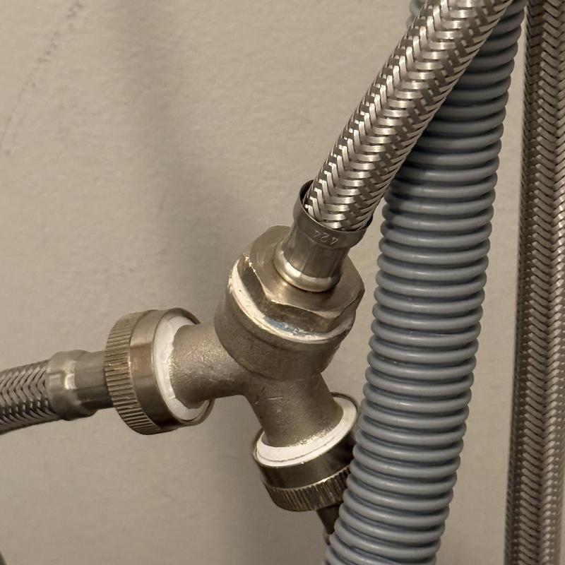 A technician from Kendrick Plumbing and Gas tightened a leaking hose connected to a washing machine in Smyrna, Georgia. This service stopped the small leak and restored normal function to the appliance's water supply.